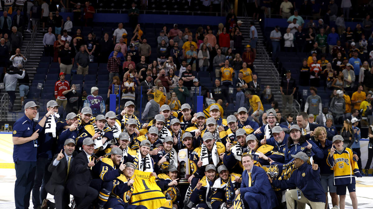 TAMPA, FLORIDA - APRIL 08: The Quinnipiac Bobcats celebrate with the trophy after winning the championship game of the 2023 Frozen Four against the Minnesota Golden Gophers at Amalie Arena on April 08, 2023 in Tampa, Florida. (Photo by Mike Ehrmann/Getty Photo: Getty Images North America